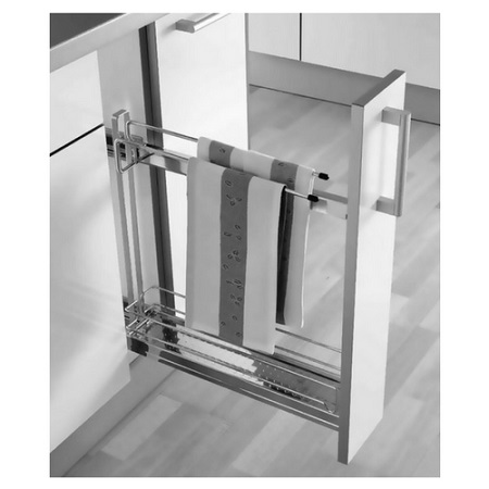 Toinen tehokas säilytysratkaisu komerossa on Tandem-mekanismi. Tämä soveltuu hiukan leveämpiin 50 ja 60cm komeroihin. Tandem-komerossa osa hyllyistä on kiinni ovessa ja loput tulevat kaapin takaosasta ulospäin käännettäessä ovea saranoilla auki.