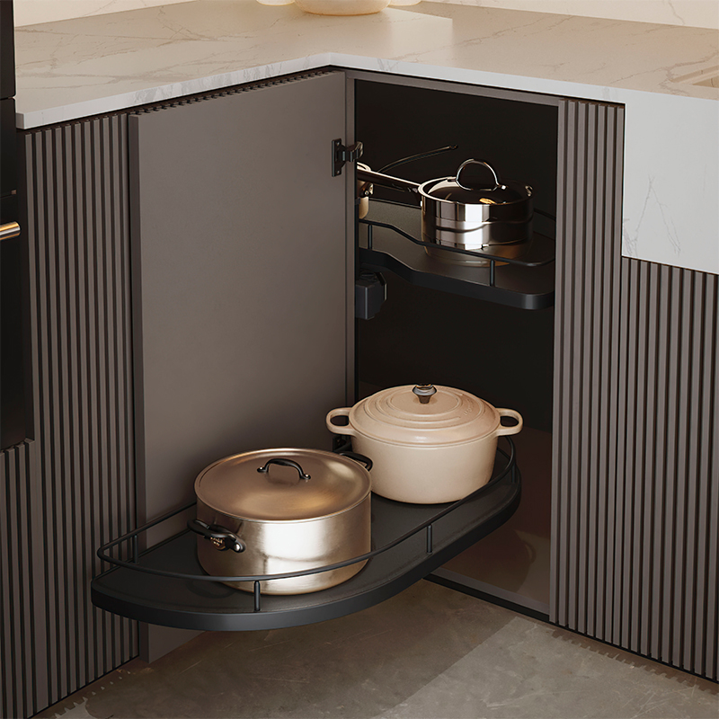 Alakaapeista tärkeitä on myös nurkkakaapit, silloin kun keittiö ei ole pelkkiä suoria kalusteseiniä. Nurkkakaappi voi olla pelkällä hyllylevyllä varustettu, mutta pyöriteltävällä tai ulos vedettävällä mekanismilla kaapin sisältöön pääsee paremmin käsiksi. Pyöriteltävässä ns. karusellihyllyssä on kaksi hyllytasoa joita voi pyörittää L-mallisen kulmakaapin oviaukossa. Tällaisessa kaapissa on kaksi ovea 90 asteen kulmassa toisiinsa nähden. Ulosvedettävä hyllymekanismi tulee yhden oven takaa ja kaappi on suora malli josta n. puolet menee piiloon viereisen seinän kaappien taakse ja näkyville jäävässä reunassa on ovi.