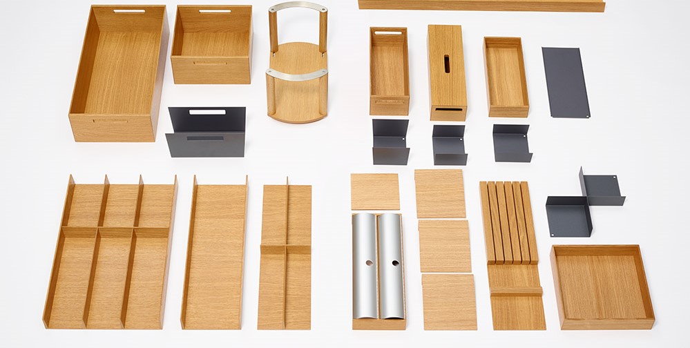 Uusi muuntautuva ja laajennettava massiivitamminen Mosaiq jakaja sekä säilytysjärjestelmä Blum Tandembox keittiölaatikoihin.